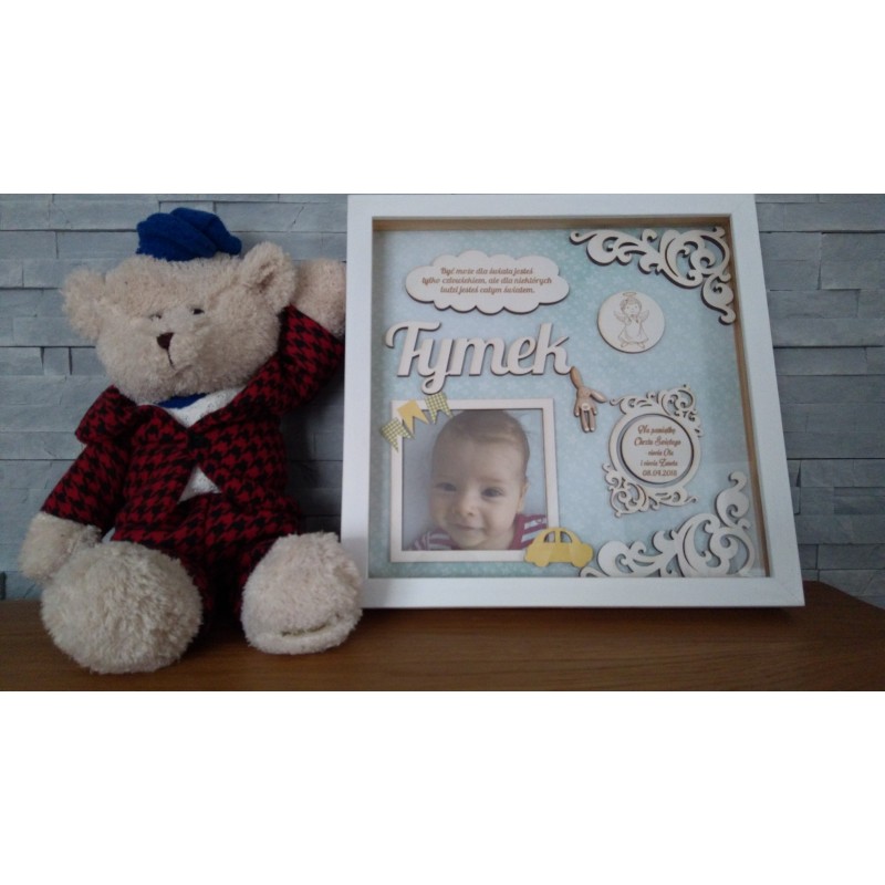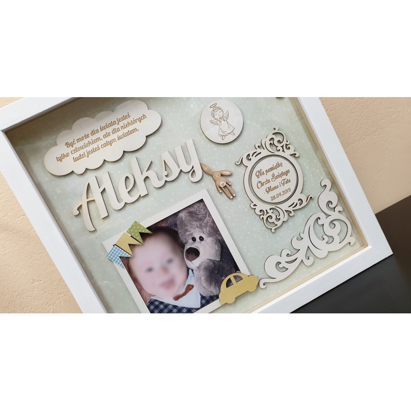 Ramka na zdjęcie stanowi idealną ponadczasową dekorację pokoiku dziecka. Ramkę można powiesić na ścianie lub postawić np. na szafce lub komodzie. Ramka wykonana jest z wysokiej jakości sklejki brzozowej. Tył ramki zabezpieczony jest płytą MDF - ramka nie jest otwierana. Idealna jako prezent z okazji pierwszej wizyty u maluszka, chrztu, Komunii oraz urodzin.