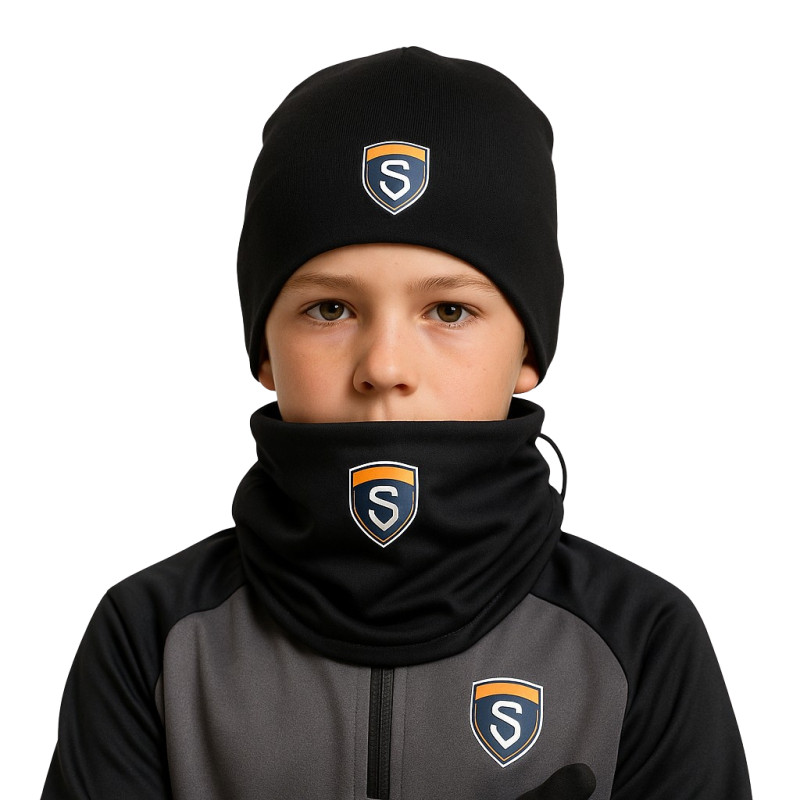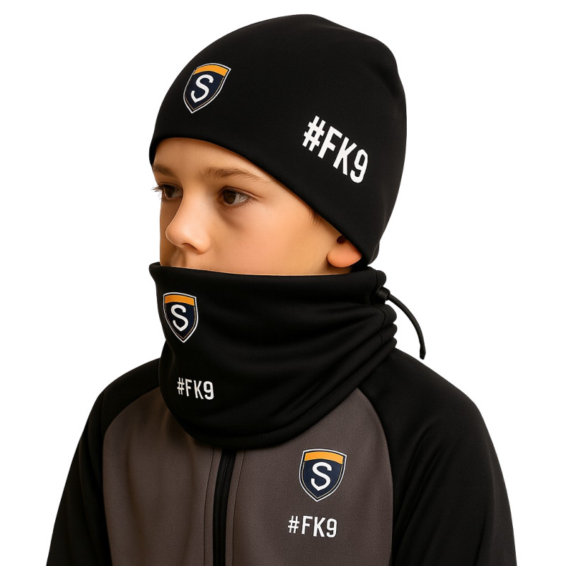 Zestaw jesienno-zimowy dla dzieci – czapka bawełniana i komin softshell ze ściągaczem. Wiatroodporny, oddychający i szybkoschnący komplet idealny na treningi piłkarskie. Możliwość personalizacji herbem klubu, nazwą drużyny lub inicjałami zawodnika.